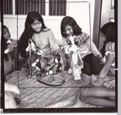 Happy School students dressed in tribal costume for a performance, 1985.