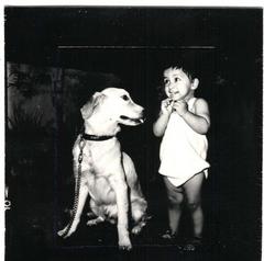 Child photographed with a pet dog