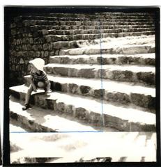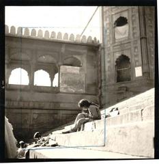 A girl photographed studying on the steps of Jama Masjid