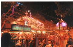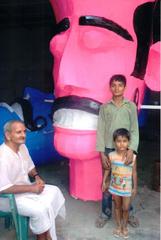 Men posing with a caricature of actress Bindiya Goswami at a fair held in Nizamuddin Basti.