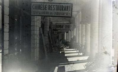 Simple designed signs indicating the 'Chinese Restaurant' and 'Bombay Sports' store at Connaught Place.