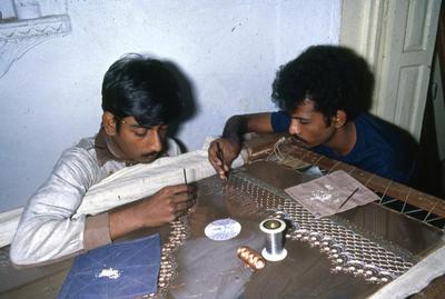 Craftsmen embellishing a cloth through the craft of zari bead embroidery, another small scale craft practiced in Delhi.