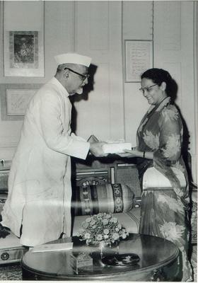 President Zakir Hussain presenting a memento to Begum Mumtaz Mirza.