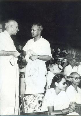 Begum Mumtaz Mirza at a sporting event with Pandit Nehru standing behind.