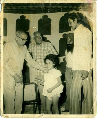 Prize distribution. On left, Jag Pravesh Chandra, Councillor Delhi. On far right, Dhanpat Seth s/o Devi Bai.
