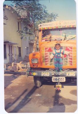A child posing in front of a newly bought truck by contributor, Kehar Singh's family. Notice the single story houses in the background.