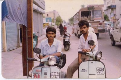 Ravi(right) and his friend on scooters in front of Studio Safdar. Notice broader roads and vehicles.