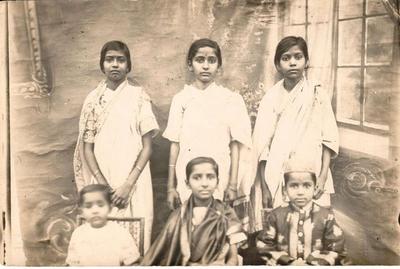 Photograph of Narain Prasad (sitting on the extreme right) with his siblings (sitting) Sarla (middle) and Shakuntala (left)