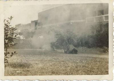Lala Narain Prasad ➔ Building clouded in smoke during the Air Raid Precaution drill.