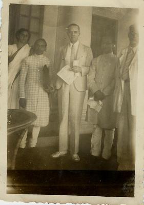 The photograph shows Richard Cripps with (L to R)- Perin Bharucha, Somnath Lahiri, and PC Joshi (extreme right)