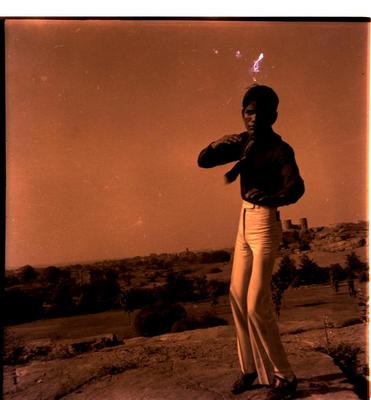 Anwar imitating a Bollywood action scene on the rocks at Mehrauli, 1970's.