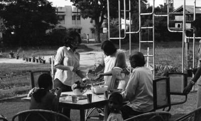 Jan Friese's family and friend out for a Picnic at the playgrounds of Amrit Kaur Bal Vihar/ The Delhi Society for the Welfare of Special Children. Afsal Friese was the first principal of the society. People in the photo: Afsal Friese can be seen serving food.