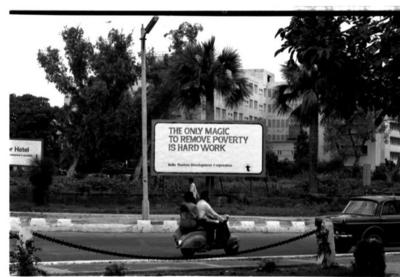 Hoarding by the India Tourism Develoment Corporation during Emergency Period (1975-1977) at a round about in Delhi. The Hoarding reads as "The Only Magic To Remove Poverty Is Hard Work".