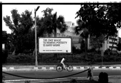 Hoarding by the India Tourism Develoment Corporation during Emergency Period (1975-1977) at a round about in Delhi. The Hoarding reads as "The Only Magic To Remove Poverty Is Hard Work".
