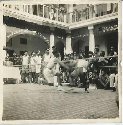 A boxing match as part of Krishanjas Roy Challenge Shield was organised by the Merchant Association at Commercial High School. Sir Shri Ram of Delhi Cloth Mill was a patron of this school. Text in the backdrop reads, " The West is West, And The East Is East But The Merchant Makes Them Meet"